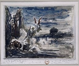 Inscr. b. c. à l’encre noire : – Le Poète et la Péri – ; b. g. à la mine de plomb : – le poète – α la péri – / – Les épreuves du poète – ; b. c. à la mine de plomb : – les nuits – ; b. dr. à la mine de plomb : – nuit orientale ;