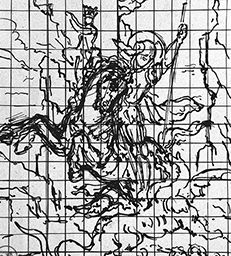 Plume et encre noire sur papier-calque contrecollé. Mise au carreau à l’encre noire