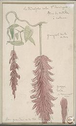 Inscr. h. c. à la mine de plomb : la Rudolphe rose St Domingue – / Flore des antilles / I volume ; c. dr. à la mine de plomb : grimpant sous les / arbres ; b. dr. à la mine de plomb : grappe / rose / se terminant / ainsi. ; b. g. à la mine de plomb : fleur grandeur de la tête humaine